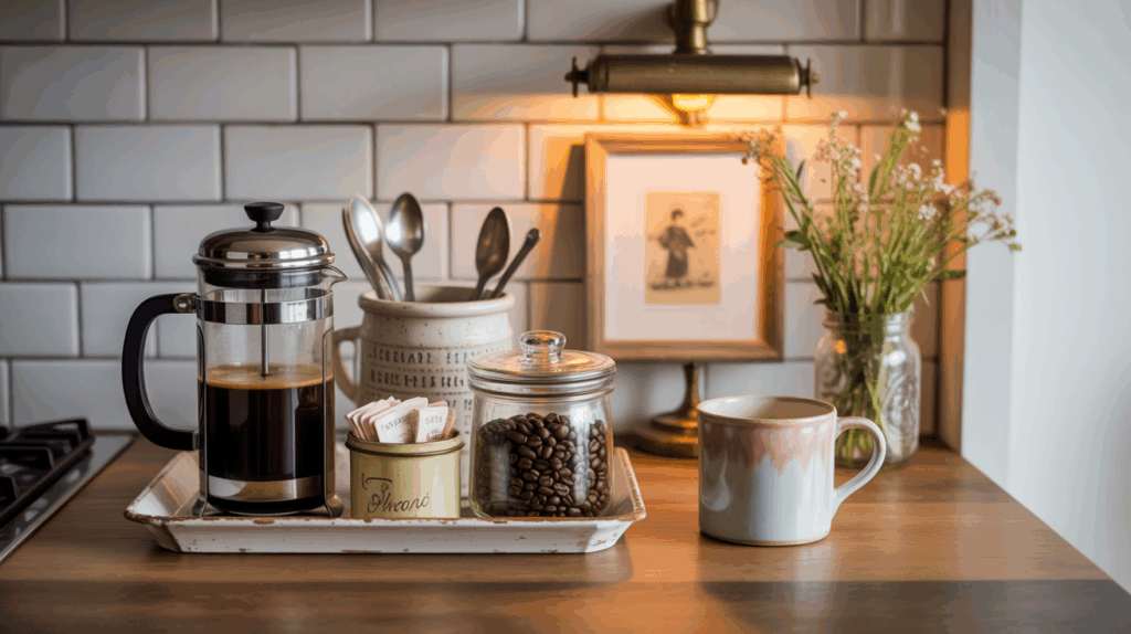 Cozy Coffee Corner: Grab a tray, a crock, and a lidded glass jar. Pop your mugs on the tray, drop your spoons in the crock, and fill the jar with coffee beans or pods. Suddenly your morning coffee station feels like a cozy farmhouse kitchen vignette instead of clutter.